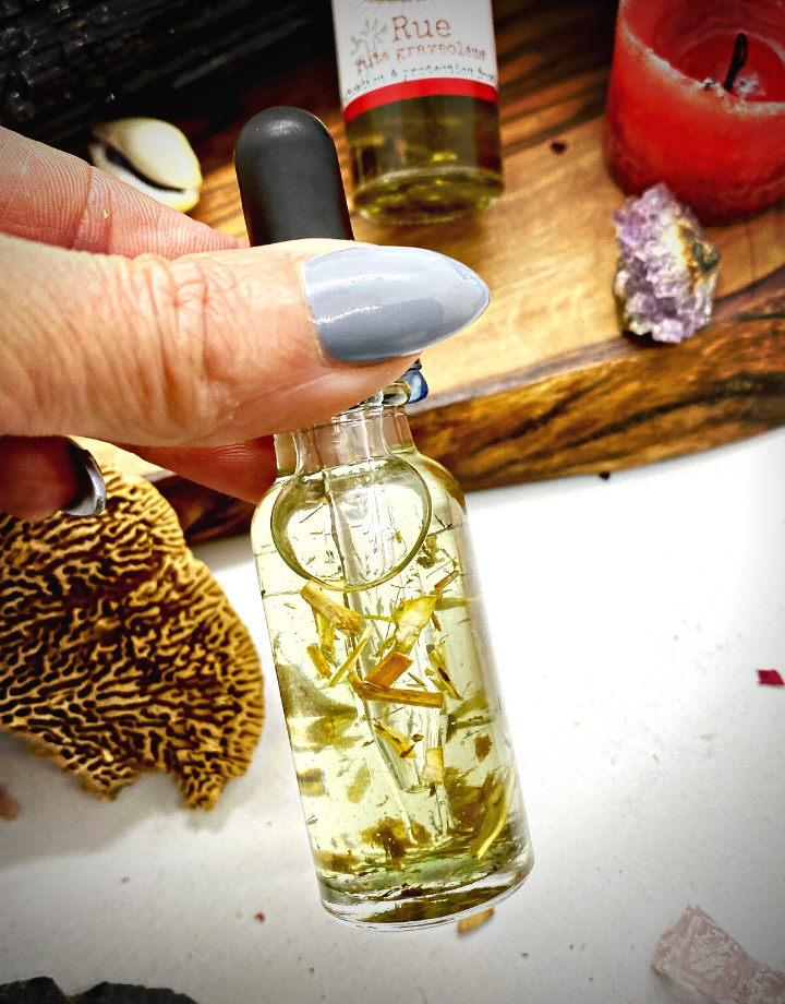 Rue is one of my favourite, and most trusted plant ali for protection, cleansing, removal of negative spirits, etc. Add this oil to just about anything for strong protection, deep energetic cleansing, reversal and evil eye magic, and removing negative blocks.