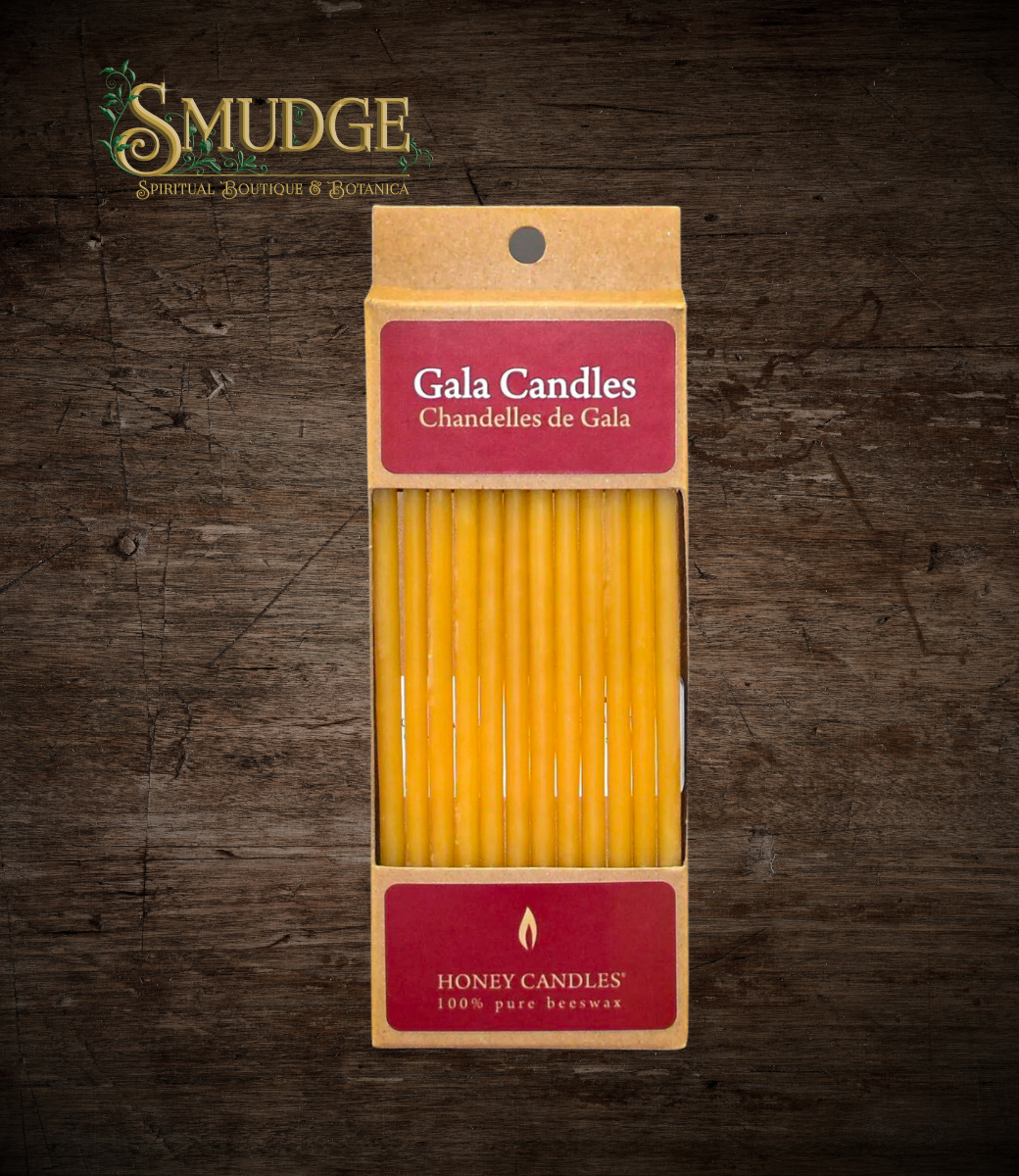A pack of 12 pure Beeswax Gala Candles in the amber colour of natural beeswax. You'll love how Honey Candles® Gala candles dress up your affair. Made with all natural Canadian beeswax, and best of all, upright beeswax Gala candles won't drip all over your cake! Try these 100% pure beeswax candles and you'll never go back!