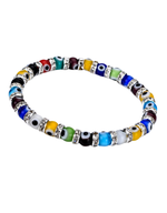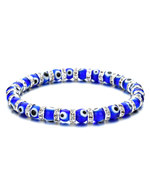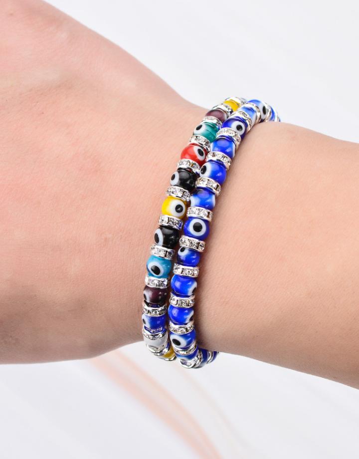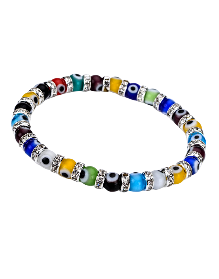 Mini Evil Eye bracelets are a stylish amulet for protection. These are perfect for stacking or layering with your favorite bracelets. Bright beads with rhinestones.