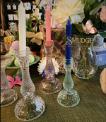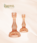 Beautiful peach vintage glass taper candle holders. A beautiful addition to your home, event or altar. These are both classic and trendsetting. Available in various colours and sizes. Peach is a wonderful colour to add love, peace and serenity to your space.