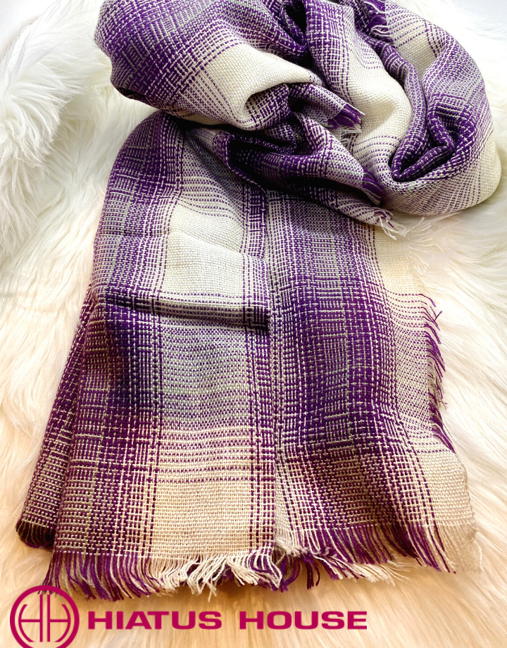 Purple and white woven scarf. This is a wide, long scarf, perfect to wear with a winter coat, or even a shawl.