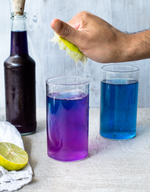 The flowers are deep blue in color with a tinge of purple that colors and flavors the water. The color goes from blue to purple when the pH level changes. Adding something acidic like lemon juice changes the color. It’s like magic!