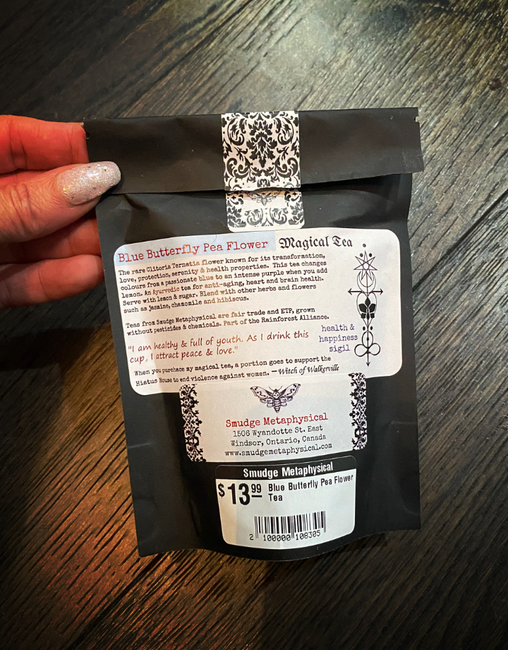 Butterfly pea flower tea is a beautiful, magickal tea. It's flowers have magickal properties of transformation, serenity, love and protection. It's high in antioxidants which helps to protect your body from cell damage, high blood pressure, and helps slow premature aging. This is a perfect cup to me!