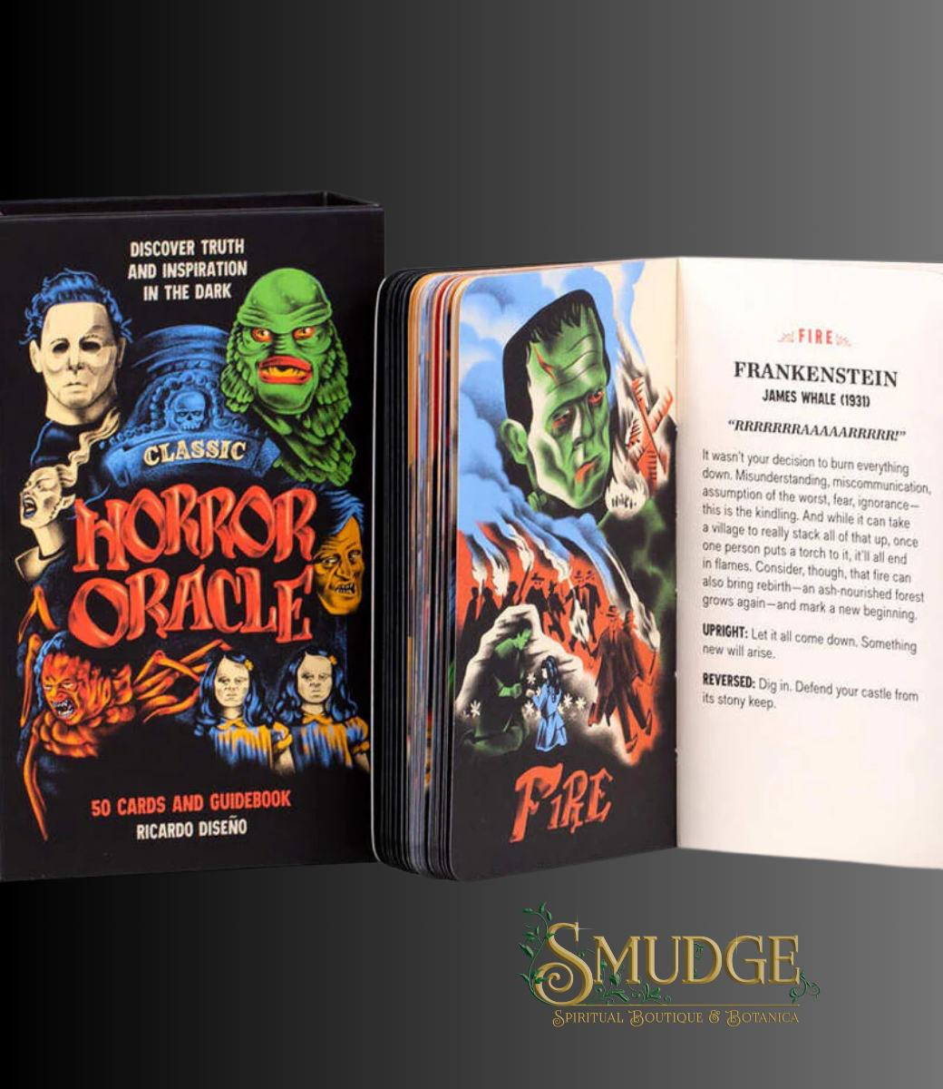 Discover truth and inspiration in the dark with the Classic Horror Oracle deck.This uniquely entertaining and beautifully creepy oracle deck harnesses the energies and dark truths revealed in iconic classic horror movies to find guidance, discover inner resources, and cultivate inspiration.