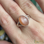 This handcrafted Peach Moonstone ring is set in 925 sterling silver, featuring a softly glowing oval-shaped stone with warm peach and champagne hues. Elegant and comfortable for everyday wear, this ring carries a gentle, nurturing energy while making a timeless statement.