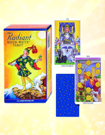 The updated look replaces Smith’s thick, black outlines with subtle shading that gives depth to the familiar scenes. Radiant Rider-Waite’s enhanced brightness highlights the traditional symbolism that readers rely on for insightful readings. The card backs have also been given the fresh new look of a star-filled deep, blue sky. Radiant Rider-Waite Tarot includes an instruction booklet with an Introduction by Stuart R. Kaplan.