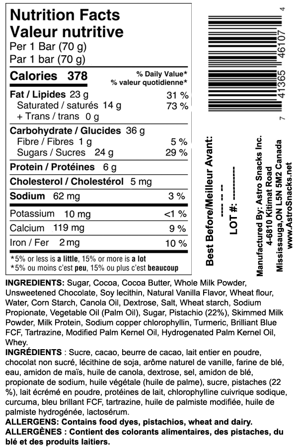 INGREDIENTS: Sugar, Cocoa, Cocoa Butter, Whole Milk Powder, Unsweetened Chocolate, Soy lecithin, Natural Vanilla Flavor, Wheat flour, Water, Corn Starch, Canola Oil, Dextrose, Salt, Wheat starch, Sodium Propionate, Vegetable Oil (Palm Oil), Sugar, Pistachio (22%), Skimmed Milk Powder, Milk Protein, So