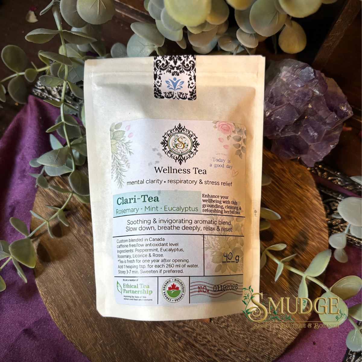 Clari-Tea is a refreshing and grounding loose leaf herbal tea crafted to support clarity, balance, and overall wellbeing. This thoughtfully blended infusion combines cooling peppermint and eucalyptus with aromatic rosemary, soothing licorice, and gentle rose petals to create a cup that feels both cleansing and centering.