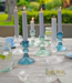 These pressed and lacquered glass holders are a classic and sure to brighten any tablescape. Designed to hold taper and dinner Candles.